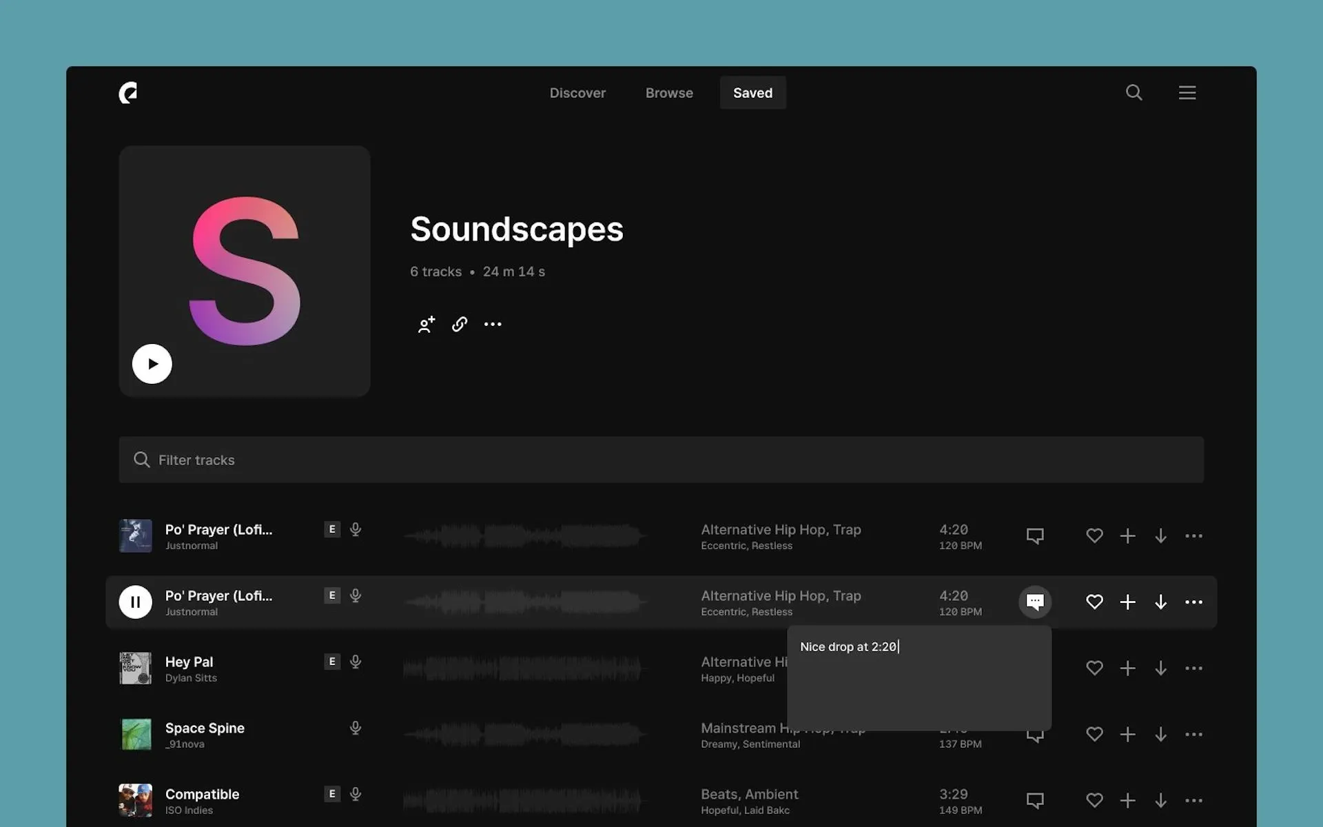 When on a playlist page, filter using the search bar to find the track you’re after and check out matching suggestions below the playlist. Share the playlist by clicking the 'Share' button at the top of the page. You can write notes for each track – just click the 'Comment' button in the track listing to post thoughts or ideas for yourself or others collaborating on the playlist.
