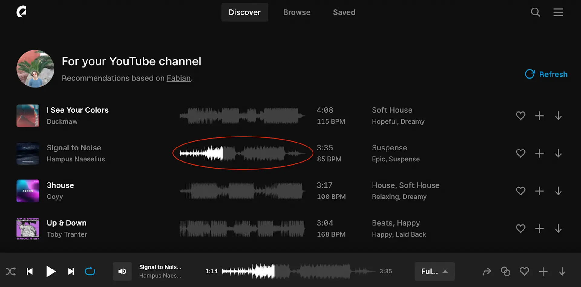 Other metadata like the genre and mood tags have been fitted besides the waveform to give you a full impression of the track’s nature. We hope this will streamline the process of finding the perfect soundtrack!