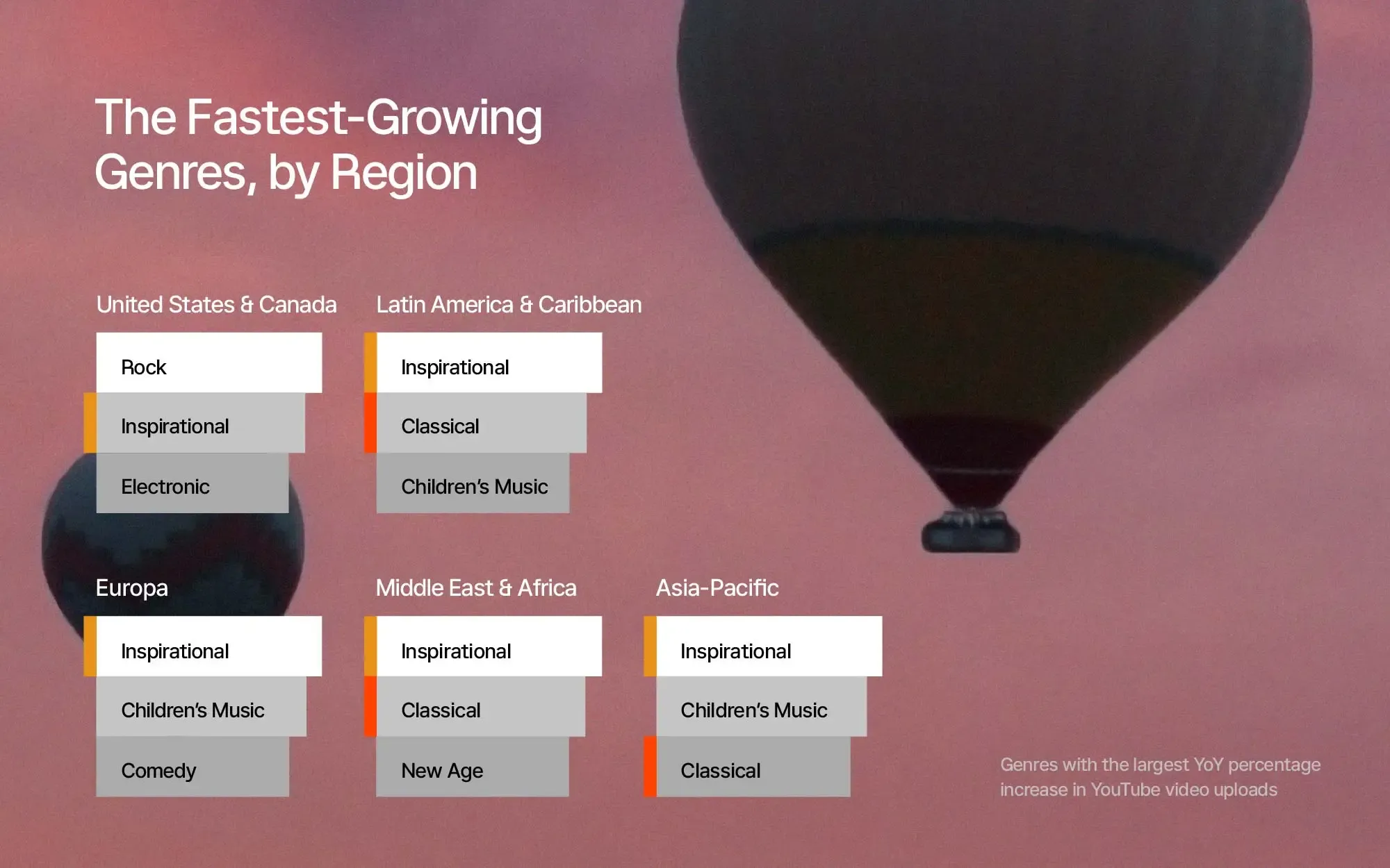 Notably, this trend isn't limited to one region; it's a global phenomenon, with inspirational music ranking first in growth worldwide and second in North America. We’ve also seen a 180% year-over-year increase in downloads of the genre from the Epidemic Sound platform.