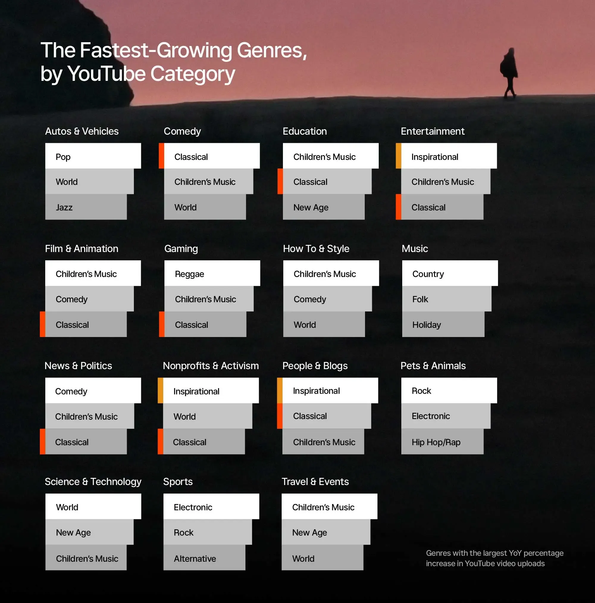The past year has been marked by a noticeable surge in usage of music that inspires and uplifts. According to our research, inspirational music on YouTube has grown by over 300% in the past year, making it the fastest-growing genre used by content creators in 2023.